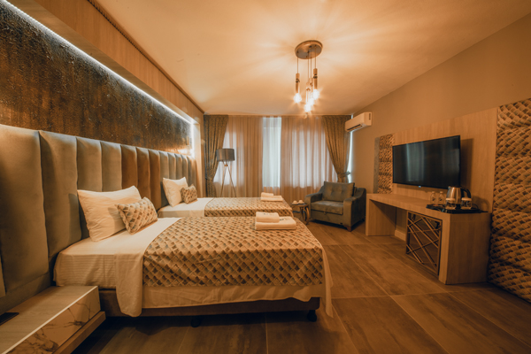 Deluxe oda 40 metrekaredir odanın içerisinde 140 ekran televizyon bir büyük double yatak açılabilir Sofa banyo, tuvalet, klima, telefon, makyaj masası, makyaj aynası ,valizlik ve kasa bulunmaktadır.